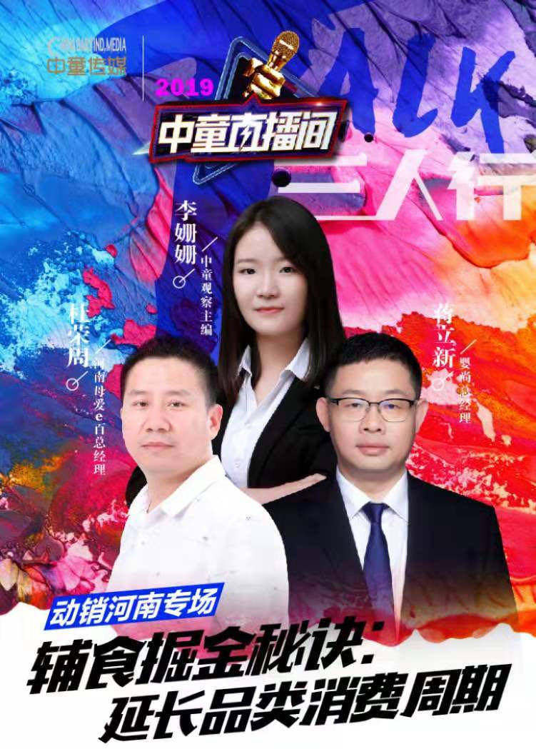 李姍姍:那今天的直播間就要在這種輕松氛圍中告一段落了。延長輔食消費周期看似很難,其實品牌與渠道配合好,就很簡單,輔食的銷量也就自然而然上去了。那么,最后環(huán)節(jié),請蔣立新、杜榮周對輔食市場以及我們中童即將舉行的動銷河南分享寄語。