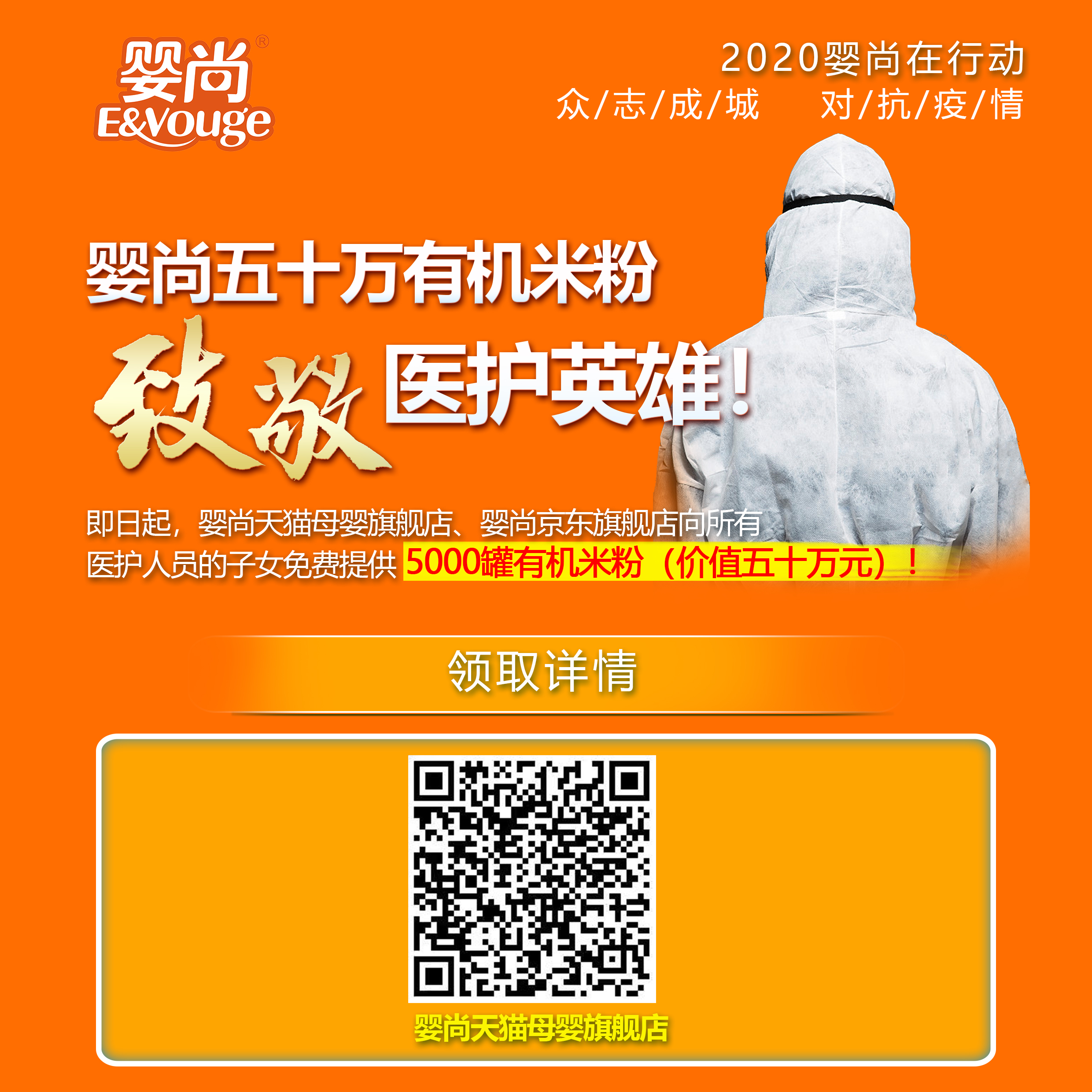 即日起,嬰尚天貓母嬰旗艦店、嬰尚京東旗艦店向所有醫護人員的子女免費提供5000罐有機米粉(價值五十萬元)!